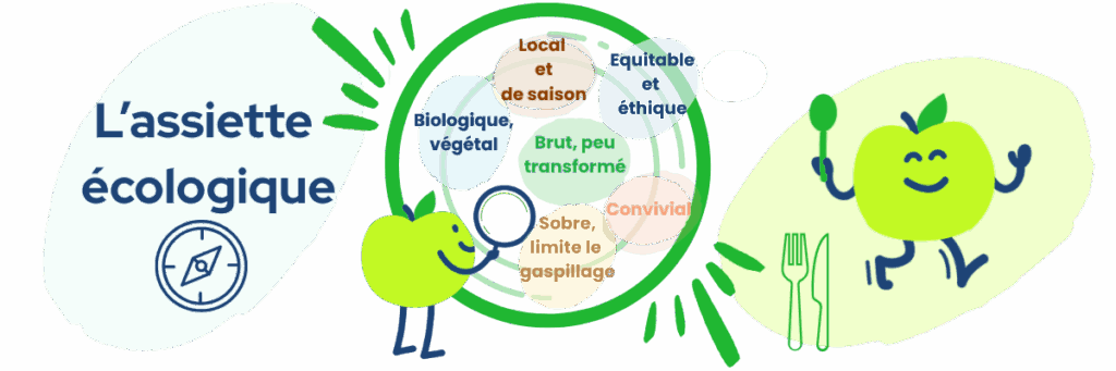 L’assiette écologique, c’est une boussole. Elle propose des critères qui peuvent guider nos choix collectifs et/ou individuels du quotidien : local, de saison, biologique, végétal, peu transformébrut, équitable et éthique, sobre sans gaspillage et convivial.